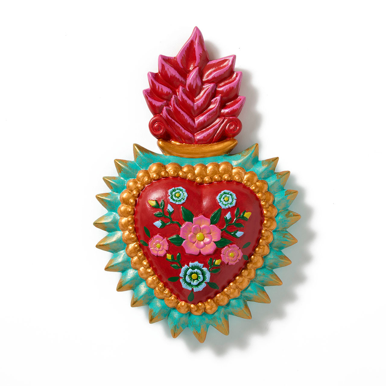 This hand-painted sacred heart featuring traditionally inspired colors and motifs makes a unique and meaningful addition to any home.