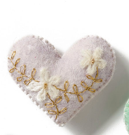 This needle-felted wool heart is hand-embroidered with floral details and bright gold thread. Perfect for Valentine’s Day, Mother’s Day and more!
