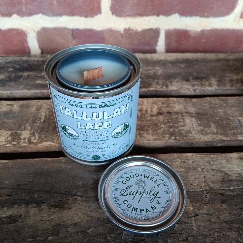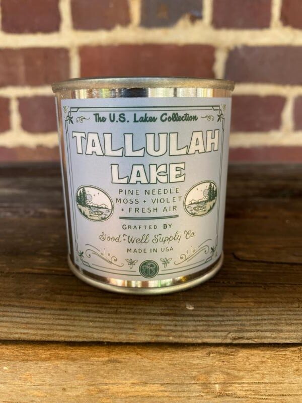 From Good & Well Supply Company comes their “U.S. Waterfall Collection” “Tallulah Falls” metal tin candle in scents of pine needles, green moss, violet flowers and fresh air. Hand poured in Seattle Washington specifically for The General Store here in Tallulah Falls, Georgia!